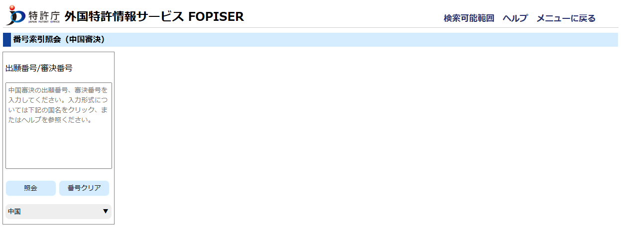 中国審決公報「98111352.4」を照会する場合 中国審決公報「200610095837.4」を照会する場合 中国審決公報「202221778179.X」を照会する場合 |