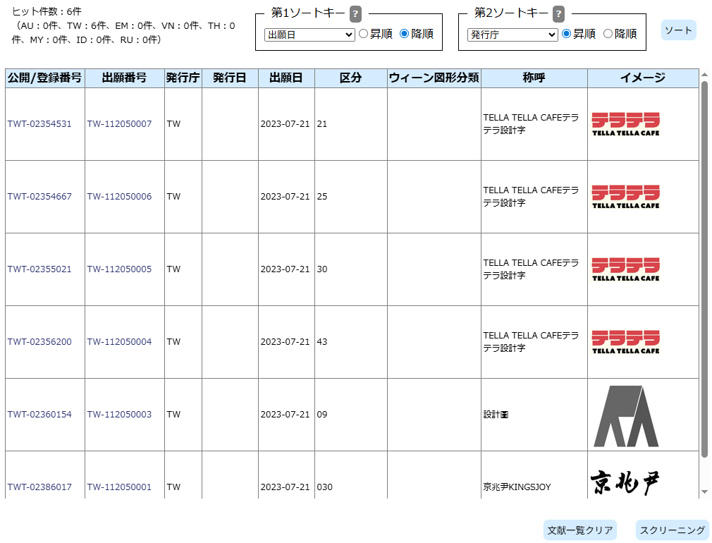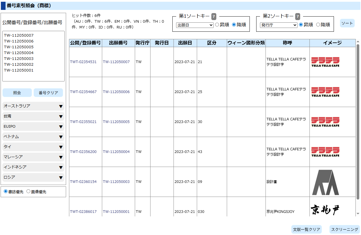 ソートキーは発行庁/出願番号/登録番号/出願日/登録日/称呼/区分/ウィーン図形分類から選択します。ソート順は昇順/降順から選択します。
