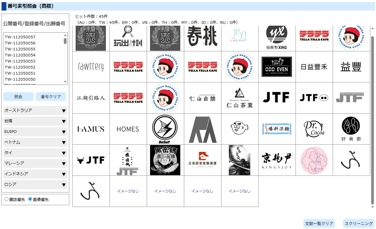 出願番号、登録番号のリンクをクリックすると、その書誌のスクリーニング画面が表示されます。