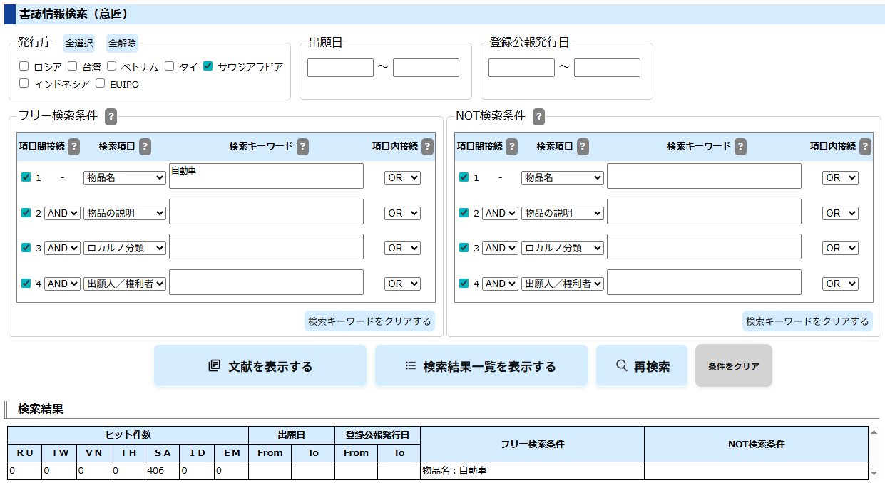 なお、各国文献のヒット件数の合計が3000件を超える場合、スクリーニング、及び、検索結果の一覧画面を表示することはできません。