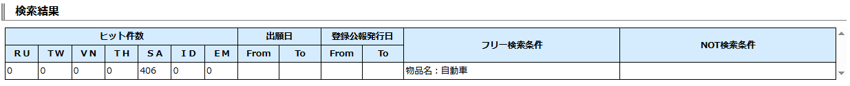 検索条件として指定した出願日・登録公報発行日が表示されます。